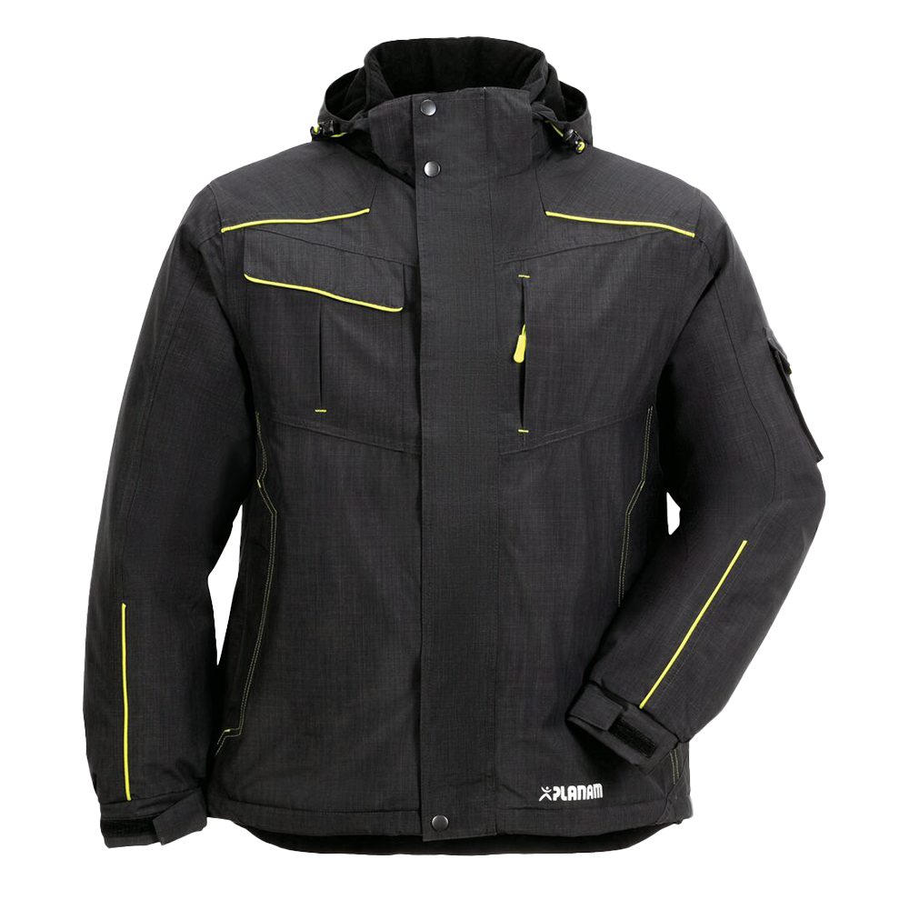 Atmungsaktiv · wasserdicht · winddicht · Nähte hinterklebt · 2 seitliche Einschubtaschen mit Reißverschluss · 1 Brusttasche links mit Reißverschluss · 1 Brusttasche rechts mit Patte und Klettverschluss · Innentasche links mit Klettverschluss · Frontreißverschluss am Kinn hinterlegt · verstellbarer Kordelzug im Bund · Handytasche auf dem linken Ärmel · verstellbare Ärmelbündchen · abnehmbare Kapuze mit Einstellmöglichkeiten · Applikationen in Neon-Farben