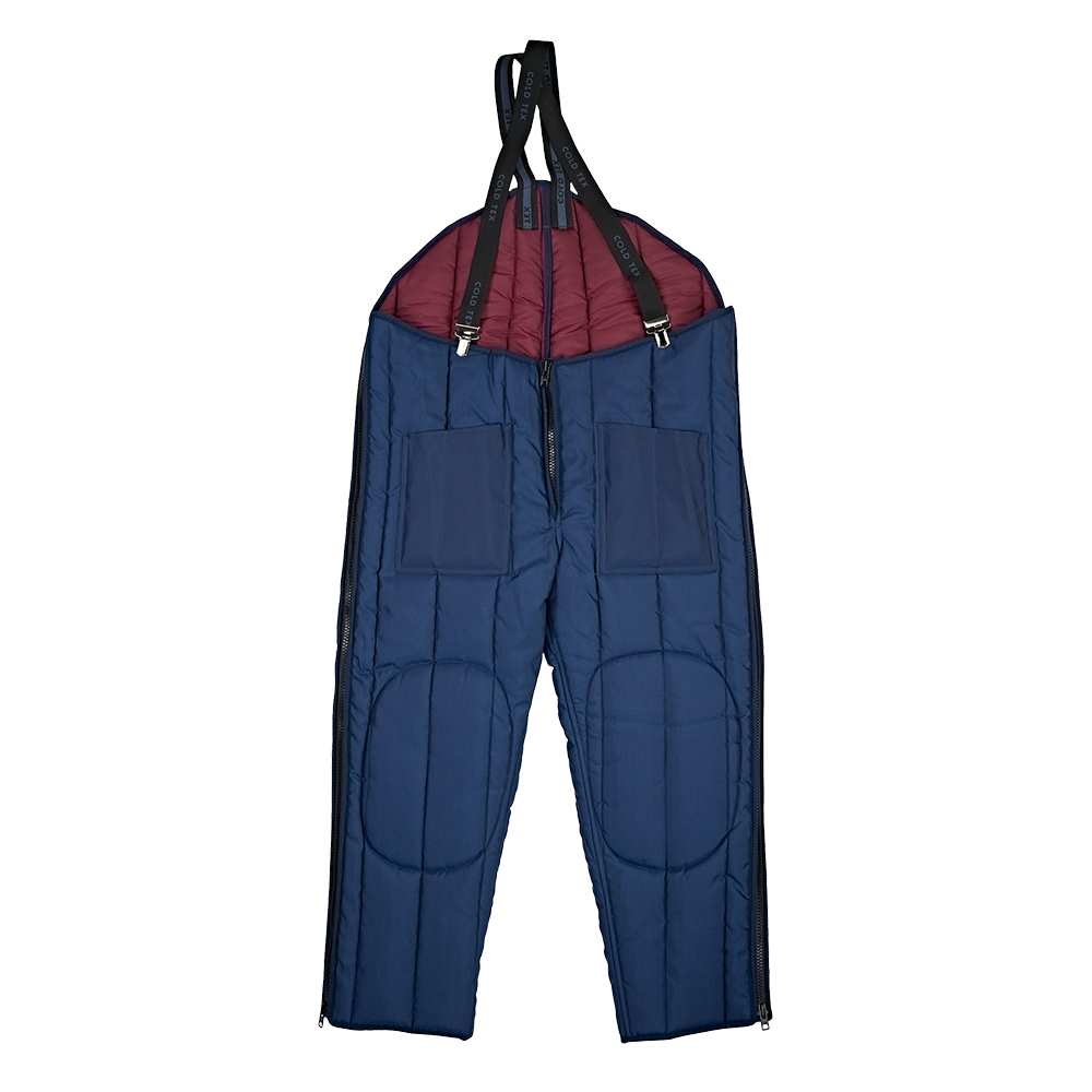 Raised back for additional protection against the cold · Adjustable elastic braces with metal clip closure · Two spacious side pockets · Comfortable entry with side YKK zipper · Zipper strip is attached inside · Reinforced knee pads