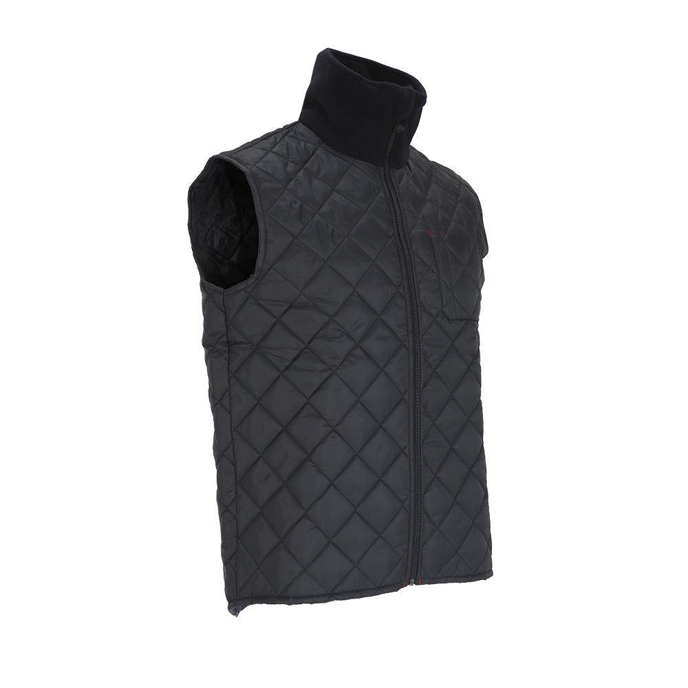 Light padded quilted vest · high fleece stand-up collar with chin protection · inner chest pocket with pen compartment on the left · extended back to warm the kidney area