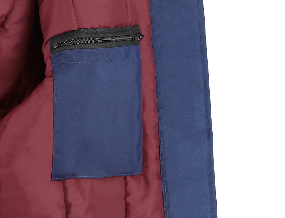 Poche poitrine gauche avec poche stylo séparée · Deux poches spacieuses avec passepoil réfléchissant · Poche intérieure avec fermeture éclair · Bon ajustement grâce à la bande élastique dans le dos