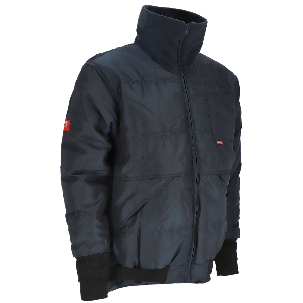 Veste légèrement matelassée avec dos rallongé · tissu Ripstop · col haut en polaire · fermeture à glissière en spirale jusqu'au menton · poche poitrine plaquée avec compartiment à stylos · poches latérales à rabat · doubles poignets en tricot.