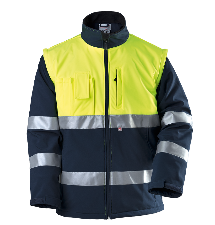 Water- en windafstotend softshellmateriaal · hoge kraag met doorlopende spiraalrits en kinbescherming · uitneembare fleecevoering · afneembare mouwen · opgezette telefoon- en pennenzak op de borst rechts · napoleonzak met ritssluiting links · zijzakken met ritssluiting · verstelbare manchetten met klittenband en extra gebreide manchetten · bovenlijf in felgeel · rondom 3M-reflectiestrepen om de romp en mouwen · Ideaal voor: wagenpark