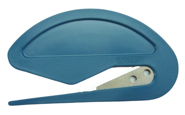 Foliesnijder met lange punt · gemaakt van metaaldetecteerbaar blauw kunststof · voedselveilig volgens de Reach-verordening · mes in roestvrijstalen uitvoering en veilig ingespoten tegen verwondingen · mes is geschikt voor voedsel
