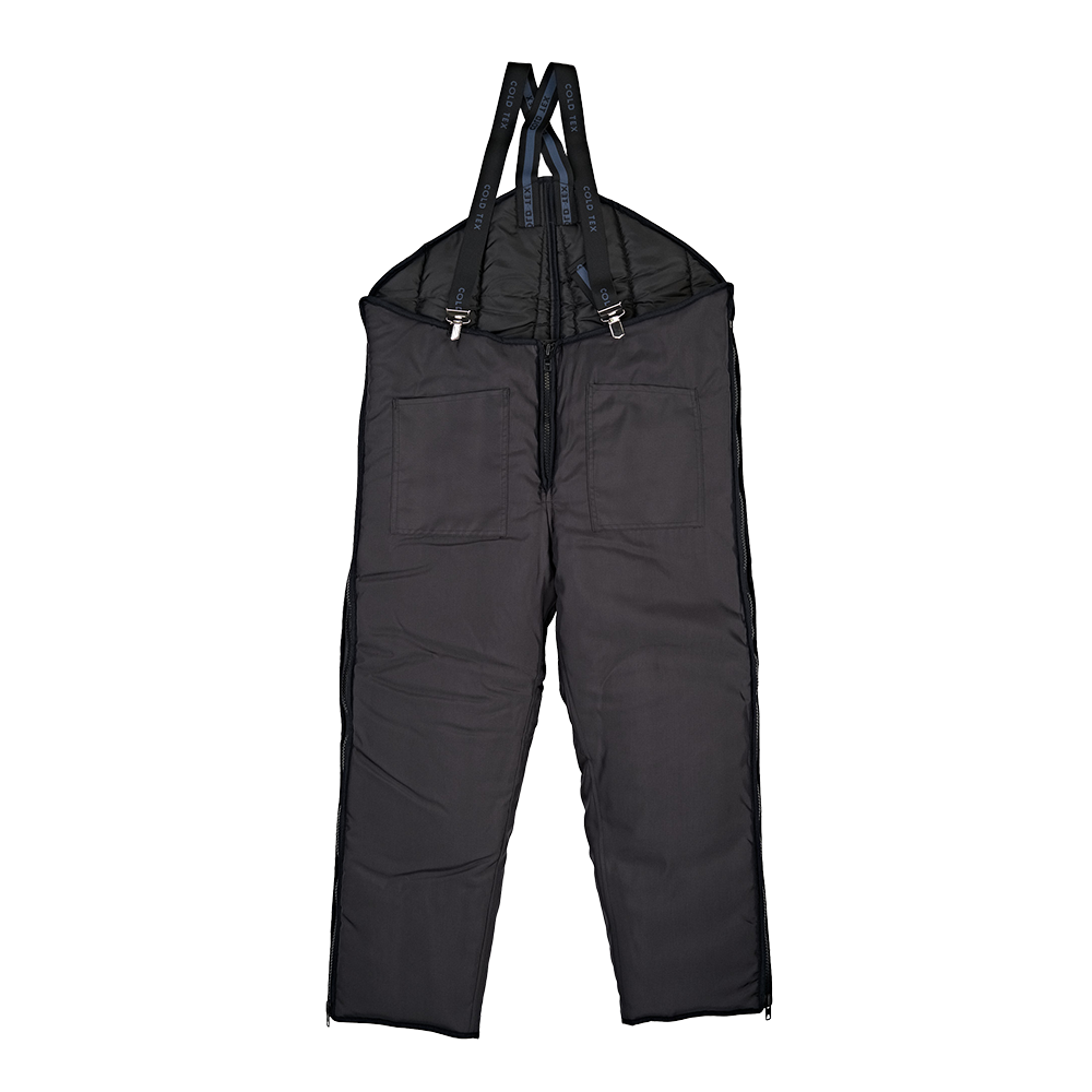 Comfortabele instap door YKK zij rits over de gehele beenlengte · Voorzien van verhoogd rugpand voor extra koudebescherming · Verstelbare elastische bretels met metalen clipsluiting · Twee ruime steekzakken · Uitgevoerd met verstevigde kniestukken