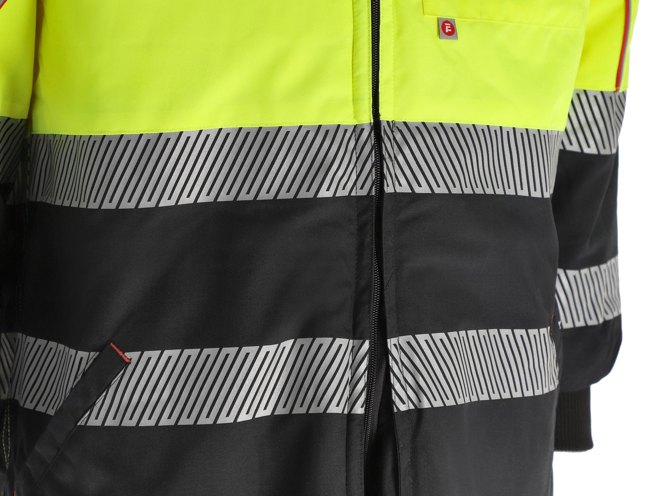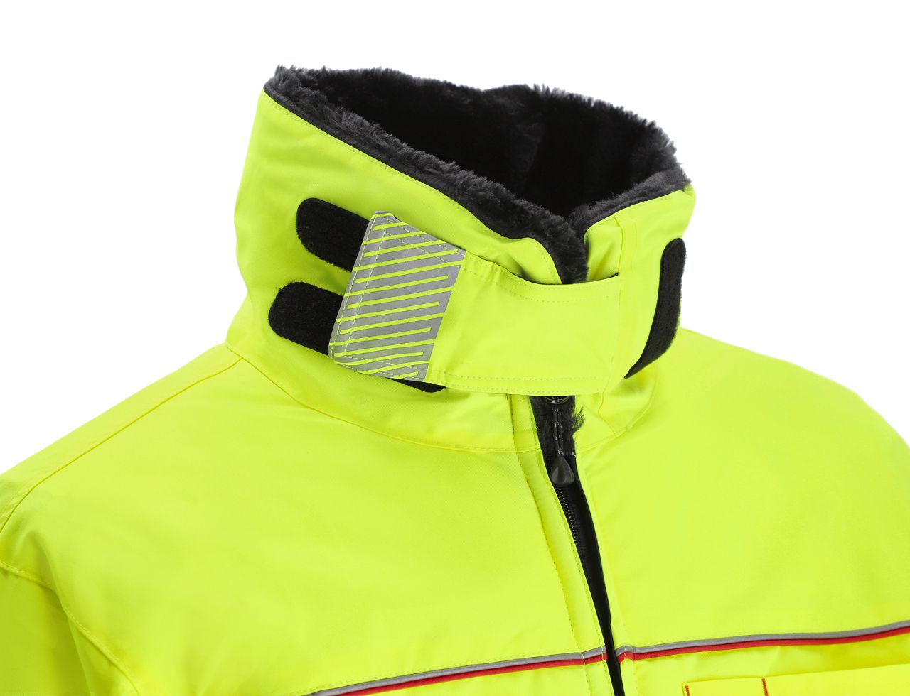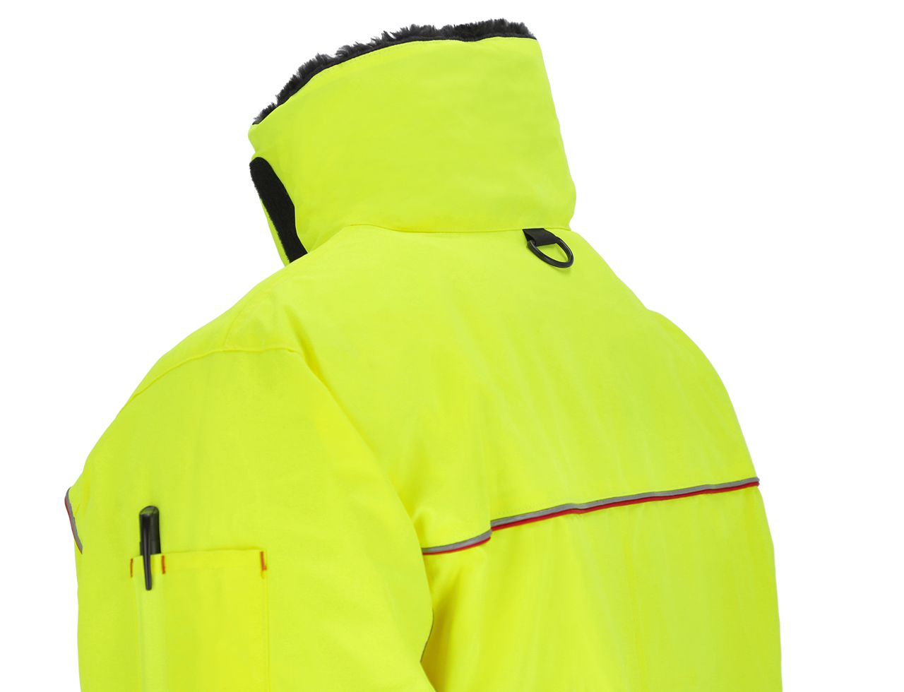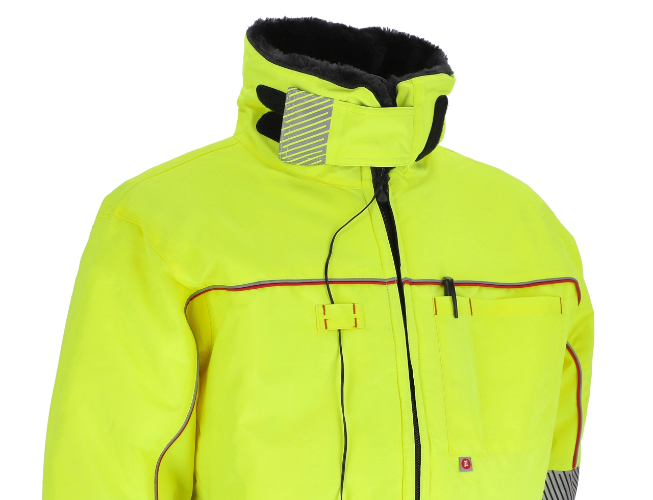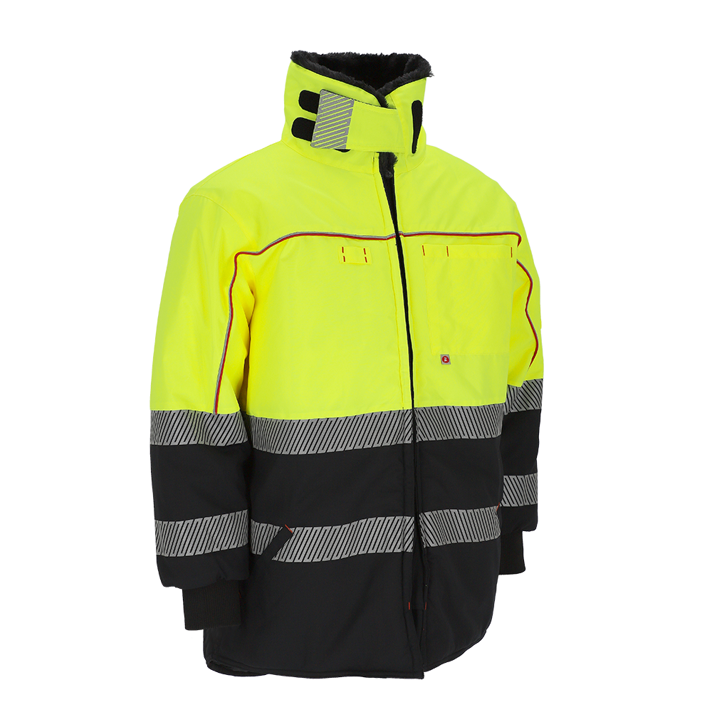 Extra dick wattierte Jacke mit Steppfutter · Polyamid-Außenmaterial mit hoher Abriebfestigkeit · gelbe Hivis-Material an Brust & Oberarm · segmentierte reflektierende Streifen um Ärmel und Rumpf · rot - silberne Paspeln in den Teilungsnähten · Stehkragen mit weichem Kunstfell gefüttert, verschließbar mit einer Lasche · Frontreißverschluss mit Dreieckseinsatz am Saum · Brusttasche mit Stifttasche links · Mikrofonhalteschlaufe rechts · Seitentaschen mit Fleece gefüttert · Armtasche mit Stifttasche links · Ärmelstrickbündchen · elastisches Gummi im Rücken auf Taillenhöhe · kann in Kombination mit der Hose FTH28 bei Temperaturen bis zu -49°C eingesetzt werden · Ideal für: Kommissionierer
