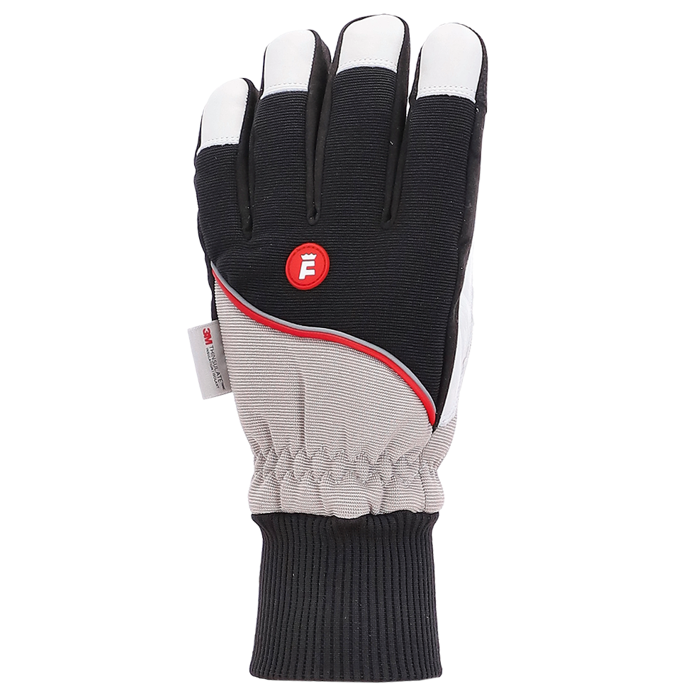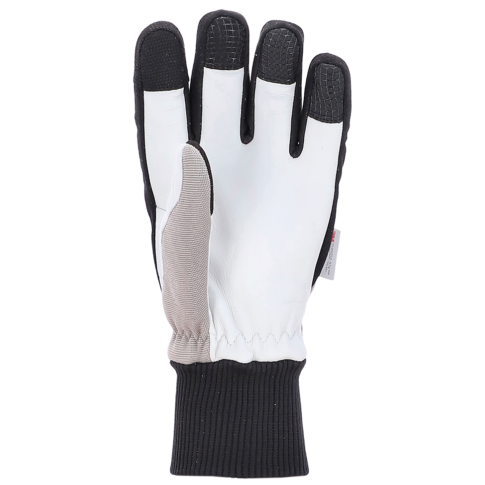 Ergonomische Passform durch vorgeformte Finger · gefüttert mit weichem Fleece · Isolierung aus 3M Thinsulate C100 · Handrücken aus robustem Polyester-Gestrick · Handfläche aus Leder · Verstärkungsmaterial mit Silikon-Grip an den Fingerspitzen, an Daumen und Zeigefinger zusätzlich mit Touchscreen-Funktion · Strickbündchen · Ideal für: Staplerfahrer & Kommissionierer