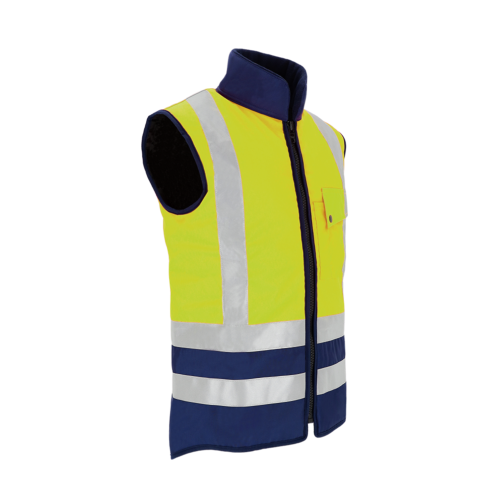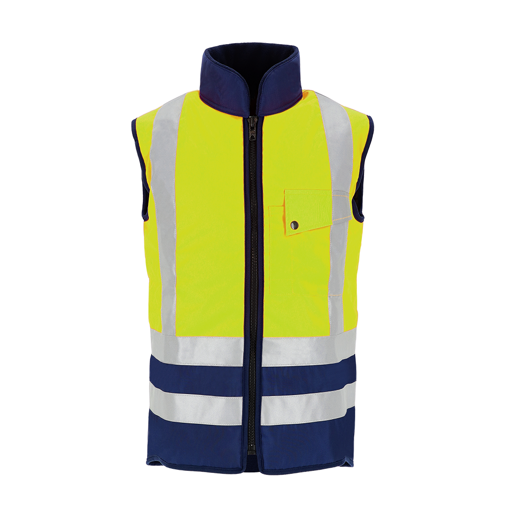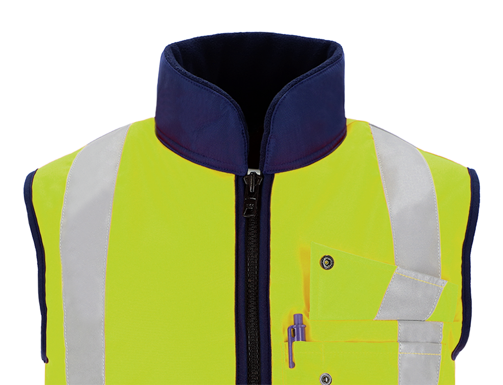 Verstärkter Fleece-Kragen · Linke Brusttasche mit separater Stifttasche · Gute Körperpassform mit elastischem Rückenteil · Reißverschlussleiste ist auf der Innenseite angebracht