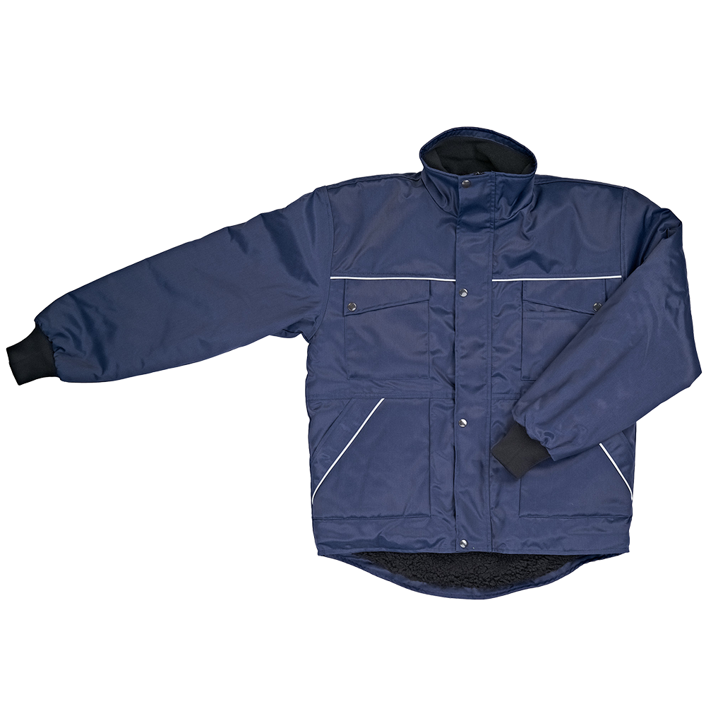 Zwei Brusttaschen, von denen die Linke eine separate Stifttasche hat · Zwei große Einschubtaschen und eine Innentasche · Wasserabweisendes Außenmaterial · Oberstoff 50 % Baumwolle, 50 % Polyamid · Teddyfutter innen · Extra langes Rückenpolster · Reflektierende Paspel